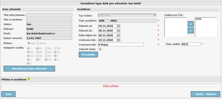 Pro osvědčení KTK a ADR se musí vyplnit ještě Stanice STK, kde je toto osvědčení platné a číslo razítka. Číslo razítka je povinné a musí být jedinečné v systému.