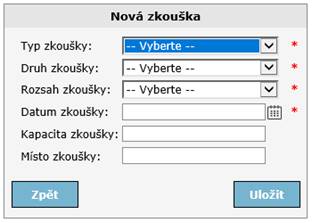 Po kliknutí na ikonu nový záznam lze zadat zkoušku. Pole označeny * jsou povinné. Kapacita zkoušky má pouze informativní charakter. Změnit lze pouze zkoušku, na kterém není přihlášen žádný účastník.