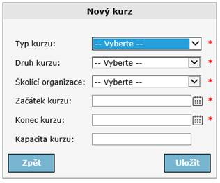 Po kliknutí na ikonu nový kurz, lze zadat kurz. Pole označeny * jsou povinné. Kapacita kurzu má pouze informativní charakter. Změnit lze pouze kurz, na kterém není přihlášen žádný účastník.