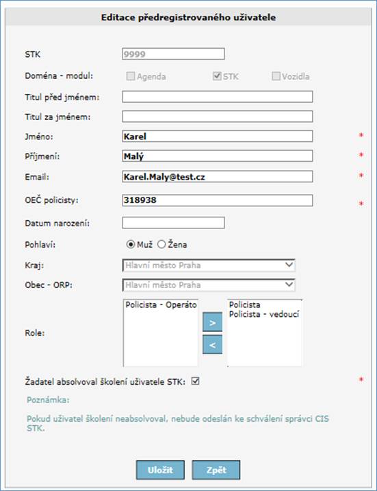 [4] Tlačítkem Zpět se vrátíte zpět na stránku Uživatelé PČR bez provedení jakýchkoliv změn.